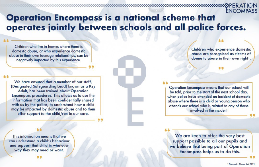 Our school participates in a Police led initiative called Operation Encompass. This is a partnership between schools and the Police that helps schools to better support any child where a domestic incident has been reported to Police from their home. In a new update, schools will also now receive notifications through Operation Encompass if children are reported as Missing from home.
